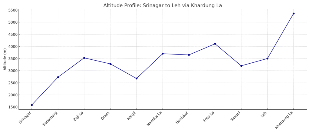 • Route: Srinagar → Sonamarg → Zoji La → Drass → Kargil → Namika La → Bodhkharbu → Fotu La → Nurla → Leh → Khardung La (optional)